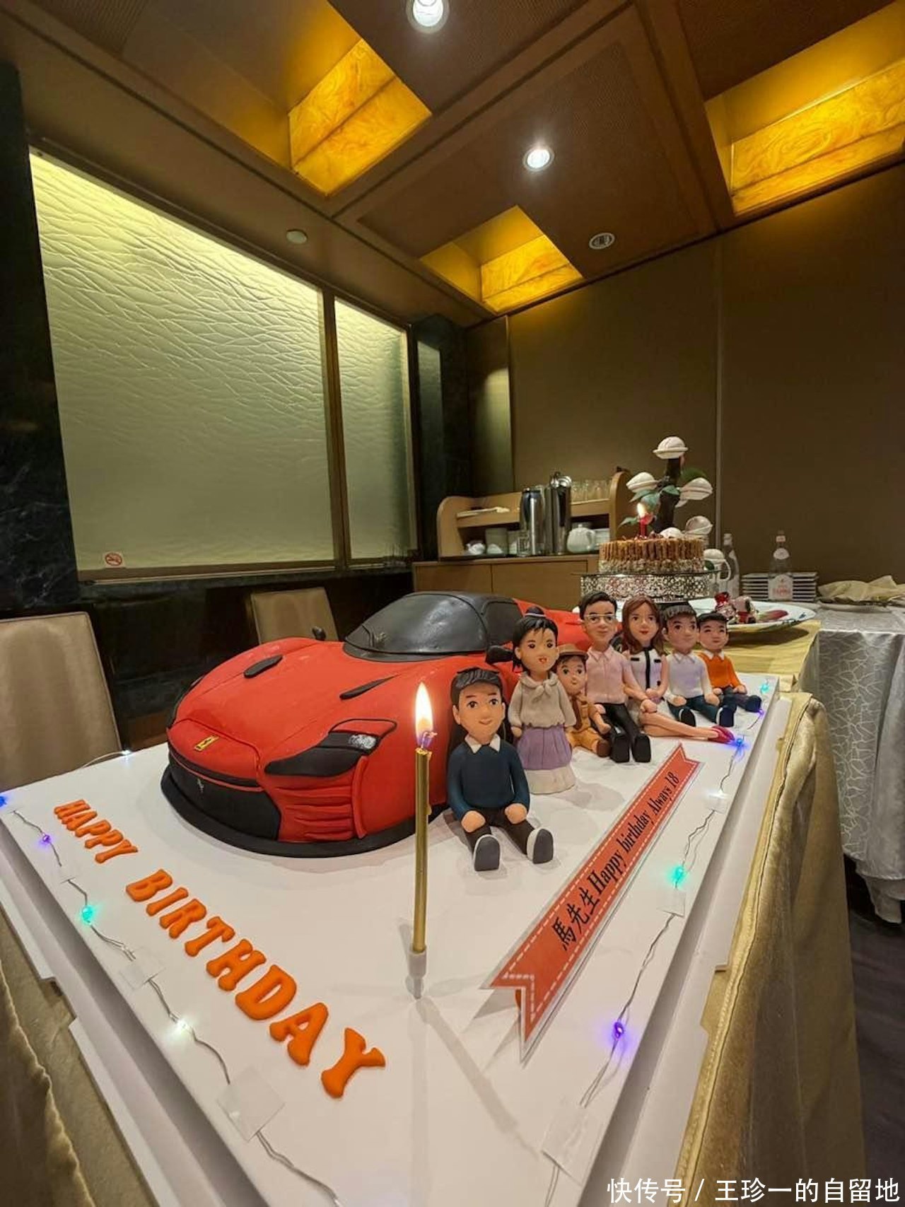 钟睿心为马清铿准备的生日蛋糕很吸睛。蛋糕造型是一辆红色法拉利,在车旁,是钟睿心和马清铿一家6口,以及钟睿心和前夫的孩子的玩偶造型。