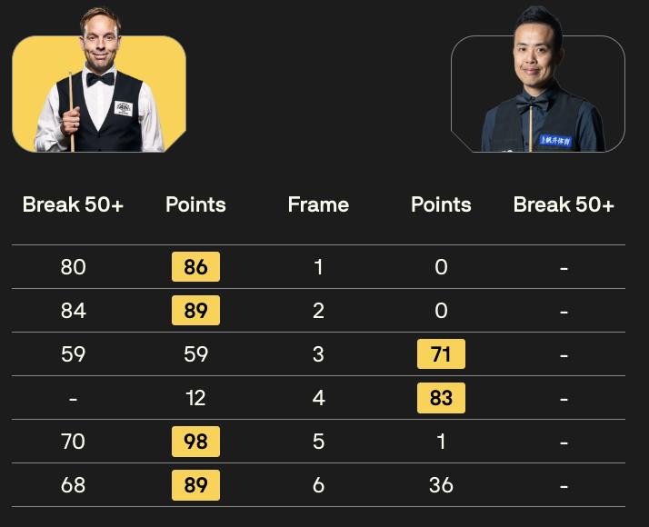 第四局,傅家俊抓住机会多次上手得分,以83-12赢下该局,将双方比分扳成2-2平。第五局,卡特单杆打出70分的出色表现以98-1拿下此局,3-2领先傅家俊率先拿到赛点。第六局,卡特单杆打出68分的表现以89-36的表现拿下此局,并4-2击败傅家俊晋级32强。傅家俊则遗憾止步首轮。