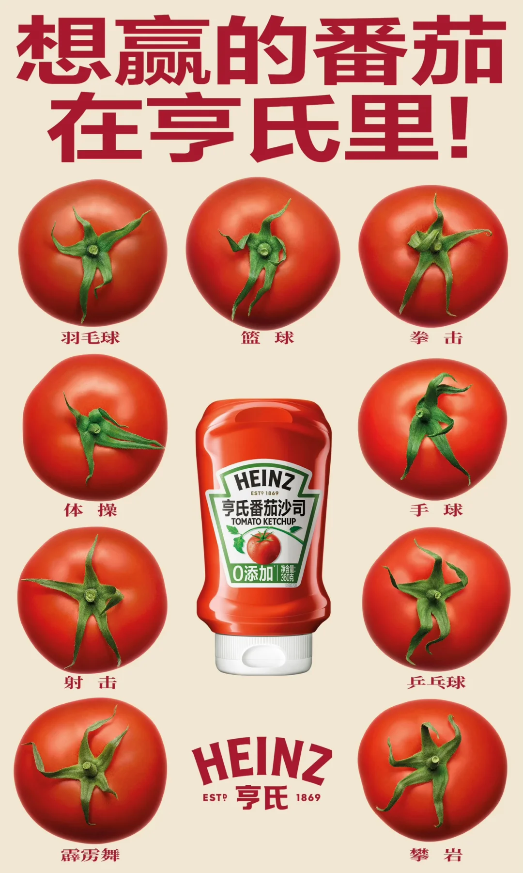比如耐克与苏炳添合作的“落足料”广告,再比如全运会期间大出圈的“亨氏”番茄沙司,用番茄蒂模拟出各种运动姿势,有趣且对眼睛友好……这些广告无一例外都被网友自动转发,被夸赞体现了“广告审美的进步”。