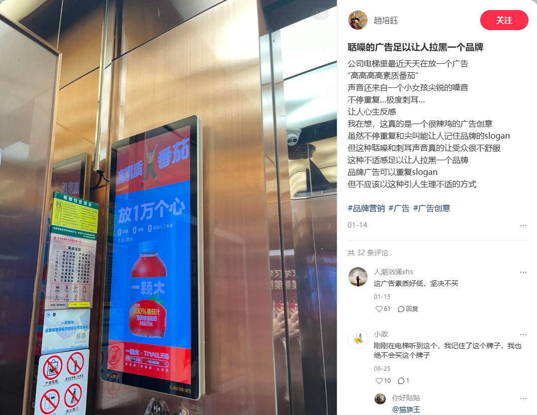 更重要的是,有声电梯广告具有“强迫性”,人们无法选择是否接收信息。一位年轻的住户说:“以前只要不抬头就不会被骚扰,现在哪怕闭着眼睛,刺耳的广告声都会直击天灵盖。”更有叛逆的消费者表示:“用广告烦人的品牌,我全都记住了,一个都不会买。”